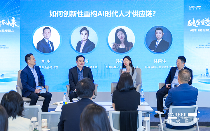 圆桌讨论环节,由凯发K8国际业务总经理李华主持,开利亚太总部招聘总监邹羽、招商局集团资深AI产品经理孙敬萍、凯发K8国际人力资源总经理陆同伟三位专家,分别从外资、央国企和民企视角,围绕AI时代人才供应链创新性重构话题展开深度对话。