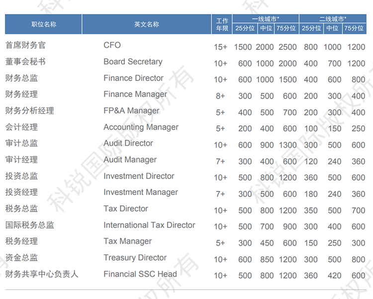 以下是猎头招聘公司凯发K8国际发布的薪酬报告对财务领域的职位薪酬信息统计,供企业和猎头招聘时参考。